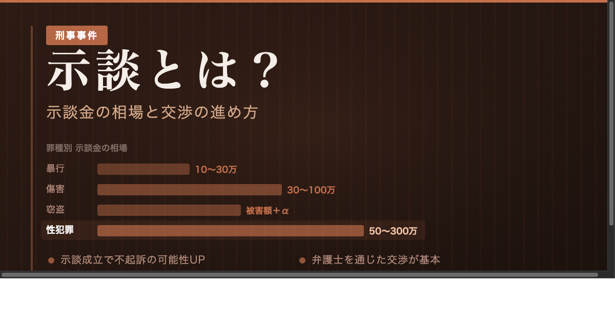 ※ 上記はあくまで一般的な目安であり、個別の事案ごとに金額は大きく異なります。実際の示談金は、被害の程度、加害者の資力、被害者の処罰感情などを総合的に考慮して決まります。具体的な金額については、弁護士にご相談ください。